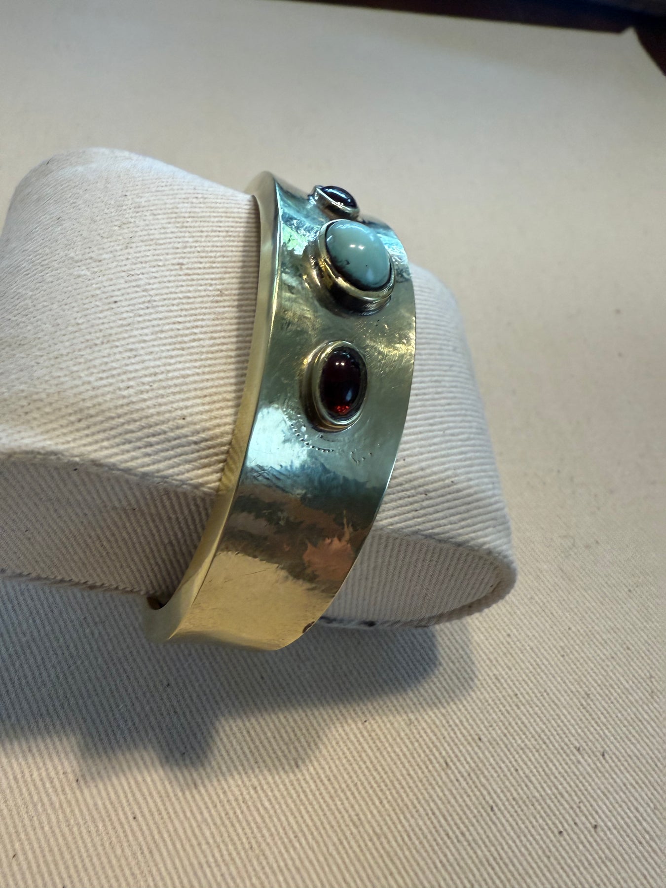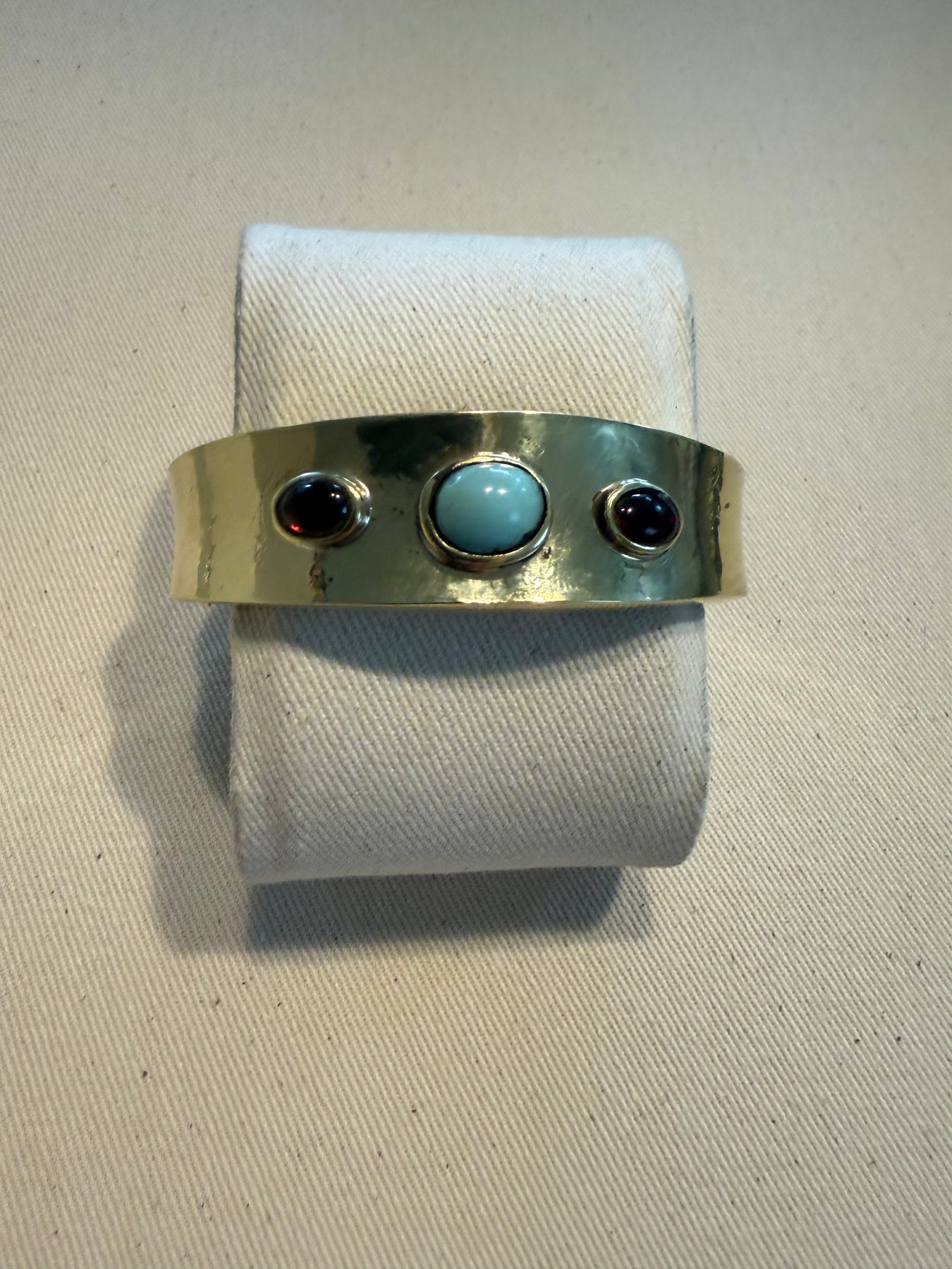 Preciosa esclava que combina bronce con la llamativa piedra turquesa, un accesorio indispensable y con identidad.