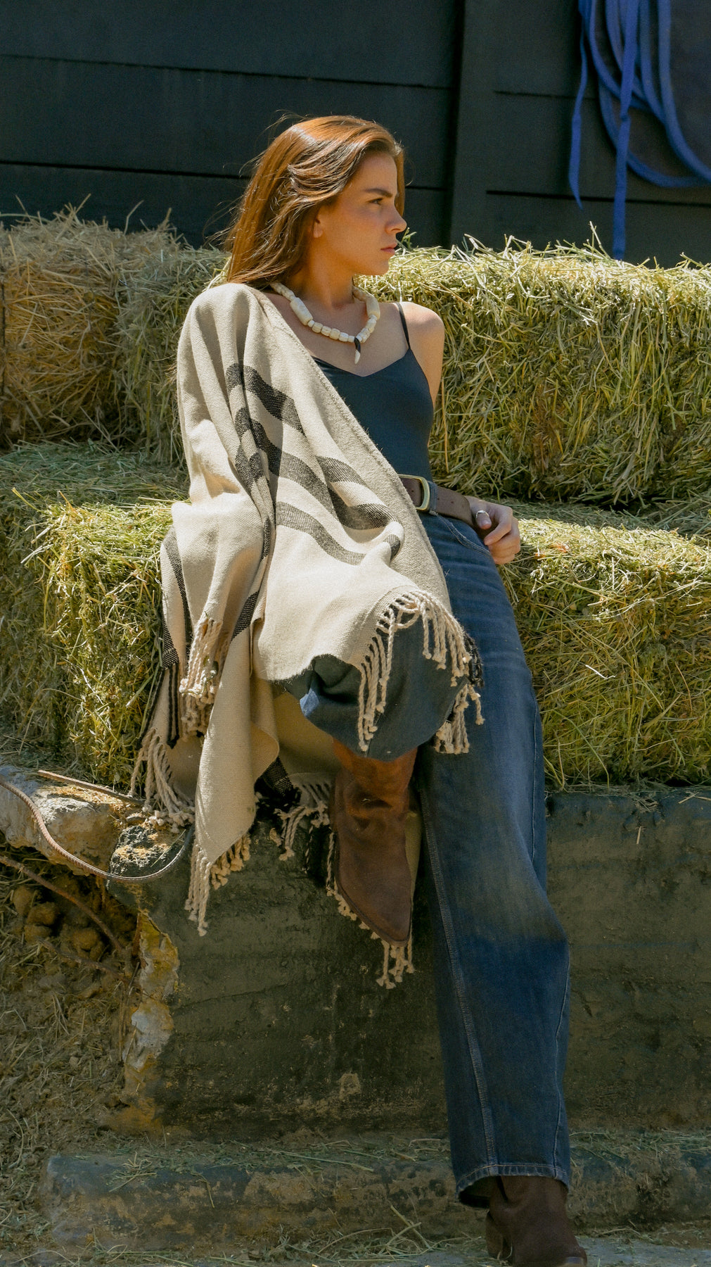 Manta de alpaca hecha a mano en telares de madera por hábiles artesanos chilenos. Su textura noble es ligera y suave, añadiendo un toque de sofisticación y exclusividad a tu atuendo, junto con una comodidad y versatilidad incomparable.