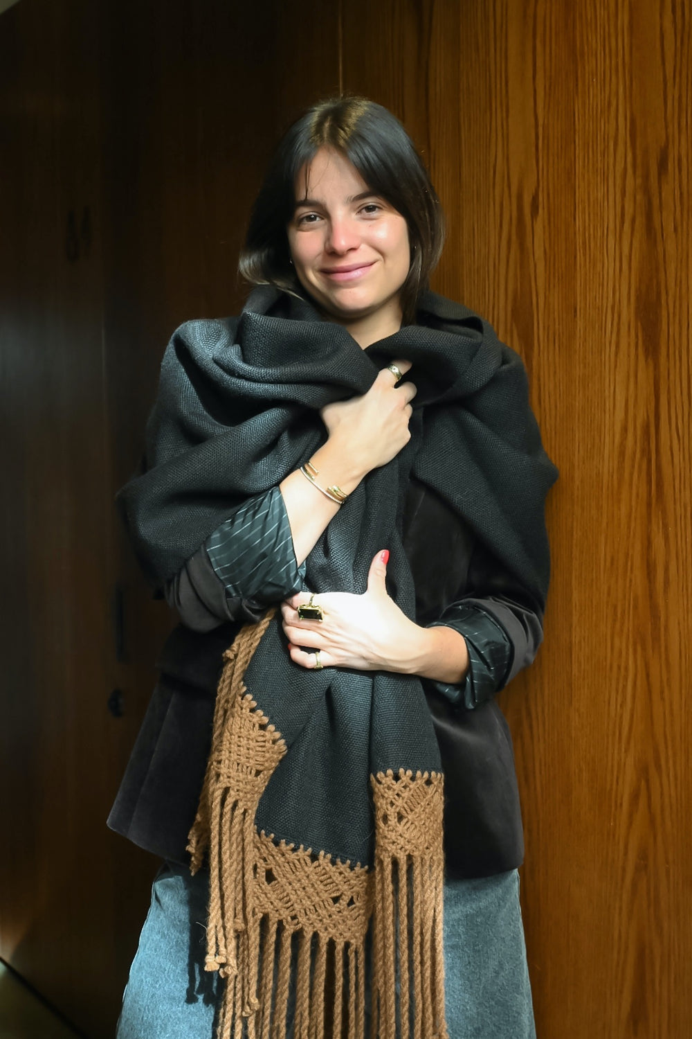 Tapado Alpaca Negro Camel Macramé
