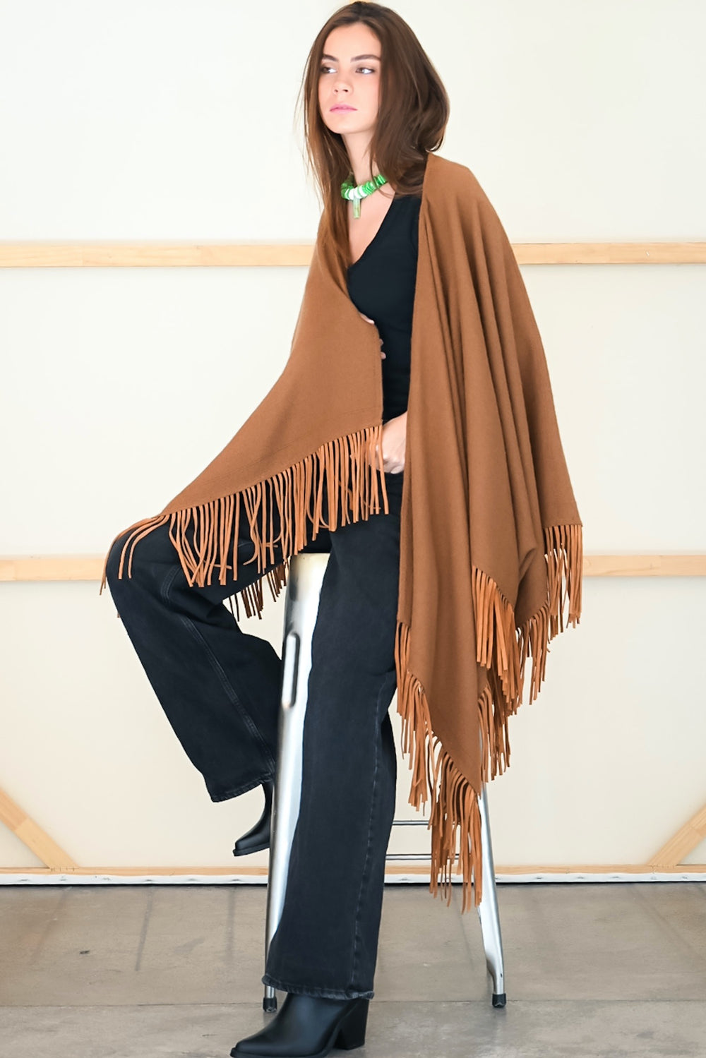 Manta de alpaca hecha a mano en telares de madera por hábiles artesanos chilenos. Su textura noble es ligera y suave, añadiendo un toque de sofisticación y exclusividad a tu atuendo, junto con una comodidad y versatilidad incomparable. El diseño se realza con elegantes flecos de cuero, que aportan un contraste distintivo y un acabado de lujo.